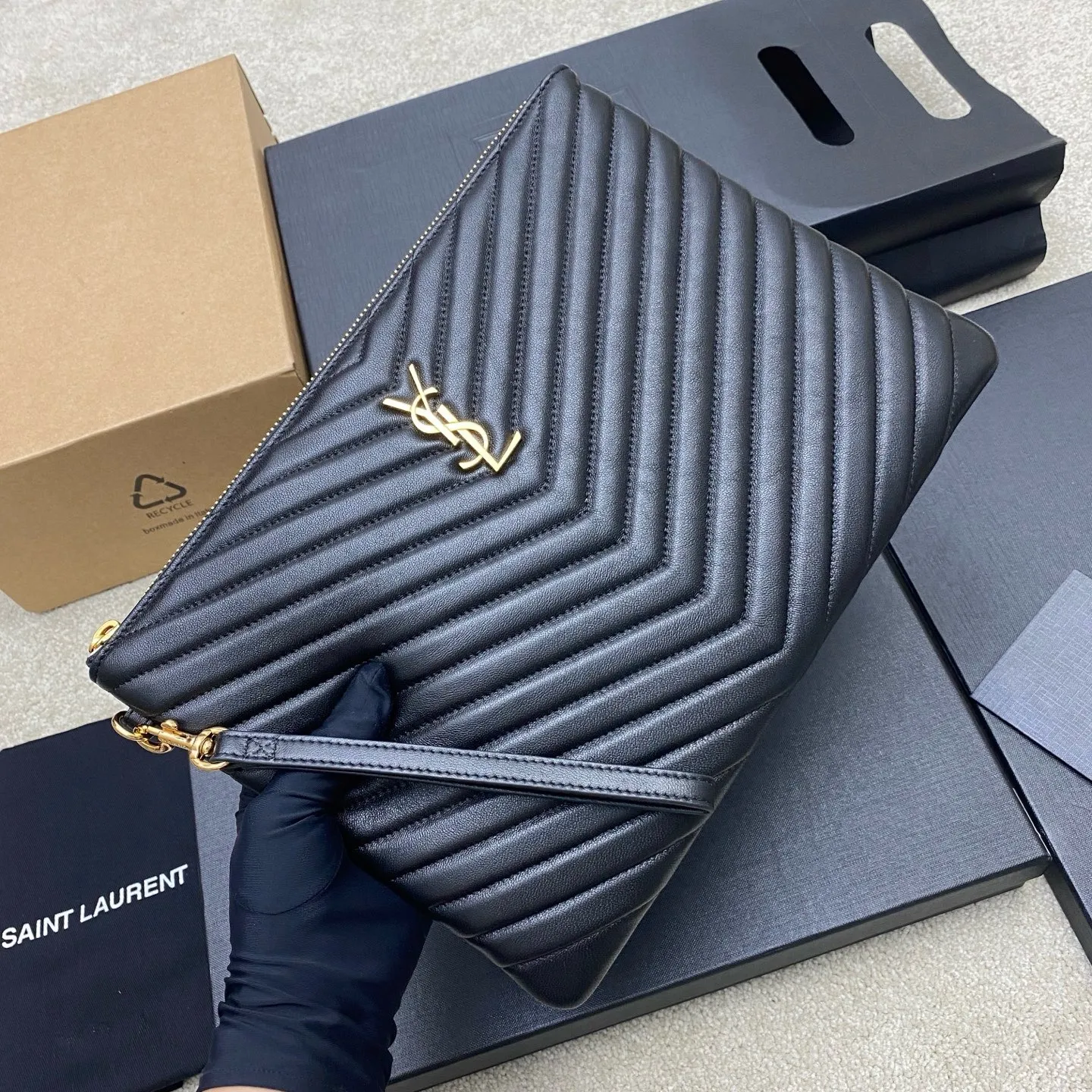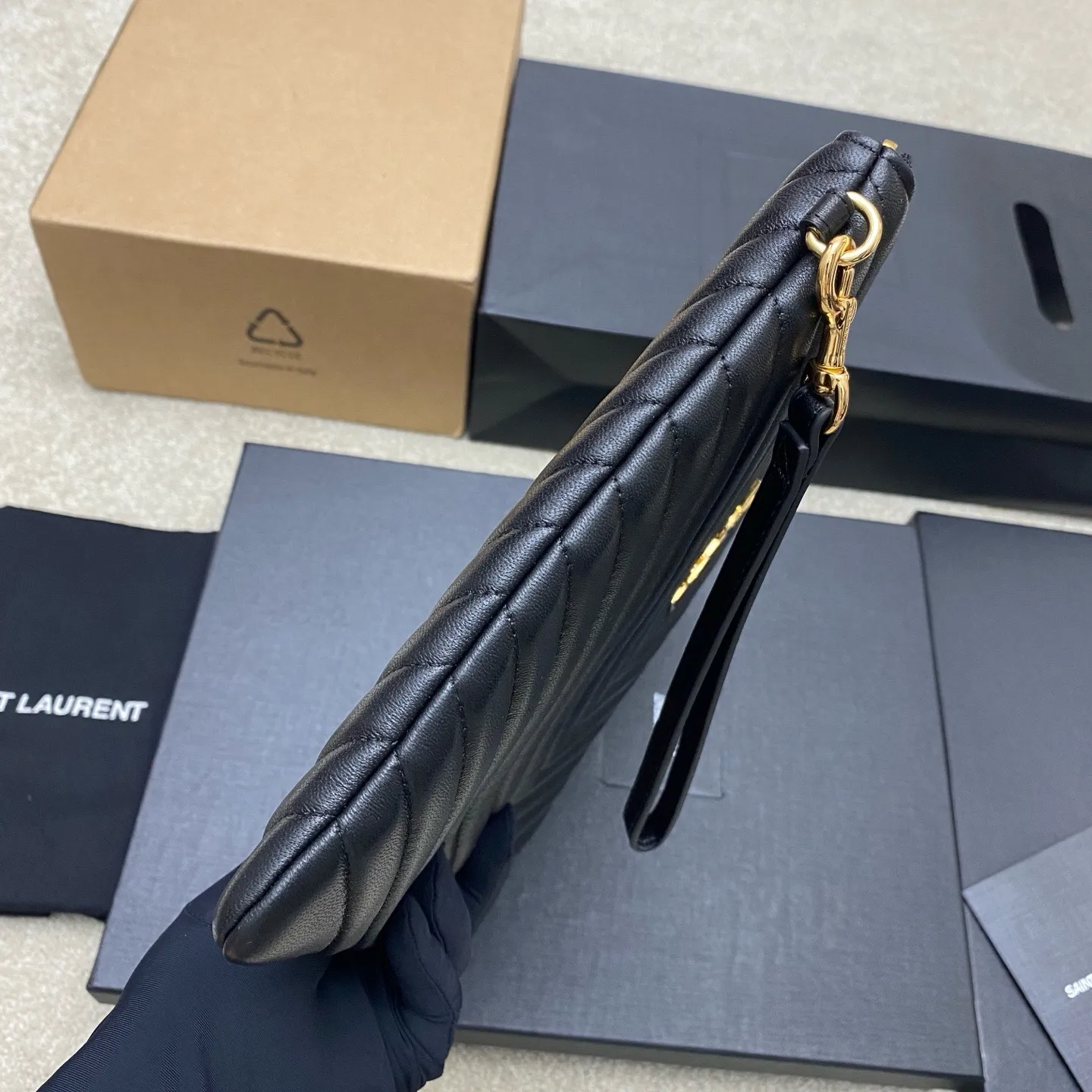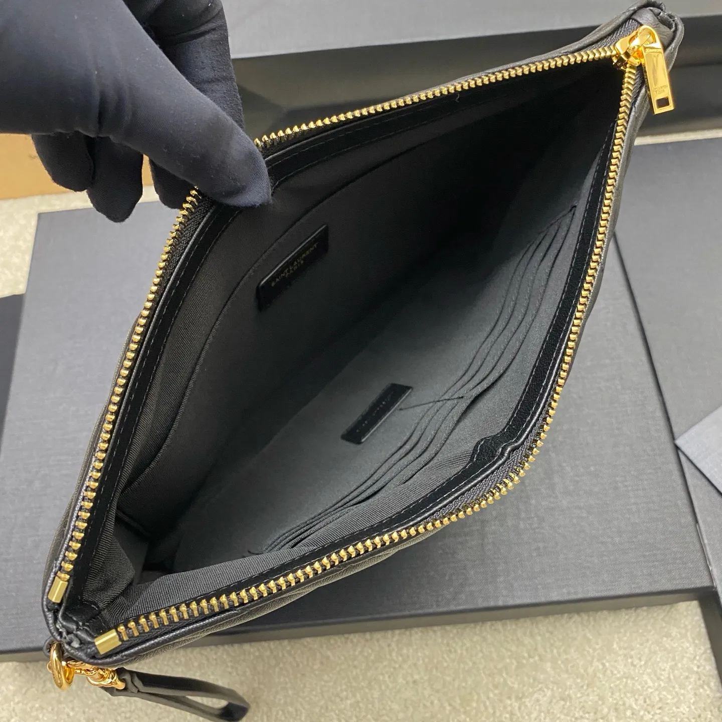 YSL Saint Laurent Paris’ new classic black clutch features a calfskin zipper closure and elegant, quilted soft lambskin with a soft, lustrous sheen. Exquisite craftsmanship ensures every detail, from the touch to the texture, exudes sophistication and elegance! 20250360